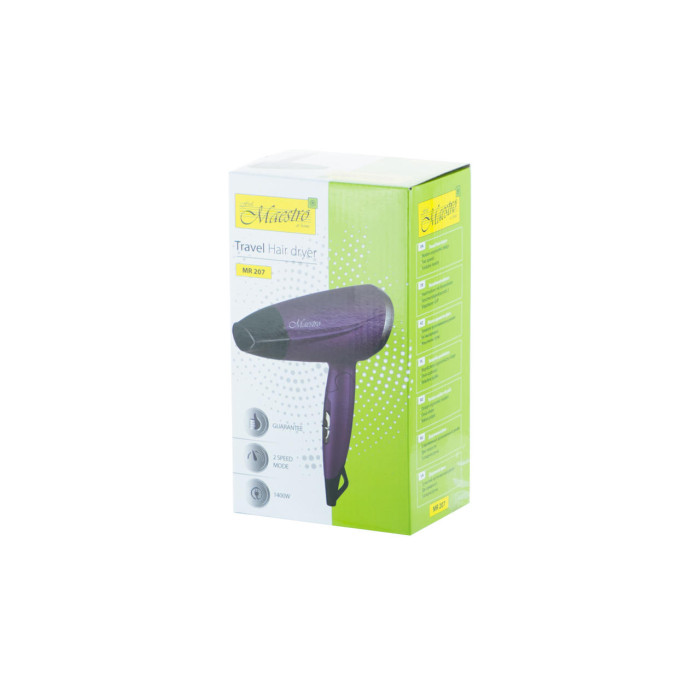 Фен дорожній Maestro MR207 складна ручка. Дві швидкості. Насадкаконцентратор. Захист від перегріву. Сучасний ергономічний дизайн. Петля на ручці для підвішування.