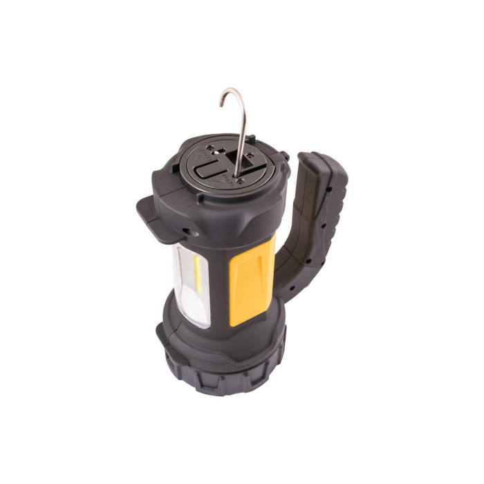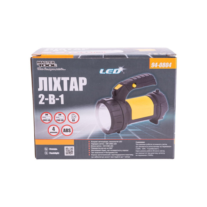 Яскраві світлодіоди, технологія LED переднє світло - 3W CREE LED/130 lumen бічне світло - 3W COB LED/200 lumen поворотна ручка на 360 ° металевий підвіс, що складається в корпус тип харчування: 4 батарейки AА корпус виготовлений з протиударного пластика, що забезпечує захист при падінні до 1 метра 4 режими роботи яскравості світла: - три режими роботи основного світла, сменяющегося натисканням на перемикач (100% - 30% - "Стробоскоп"). - один режим роботи бокового світла, включається при довгому натисненні на перемикач (100%). 2LED