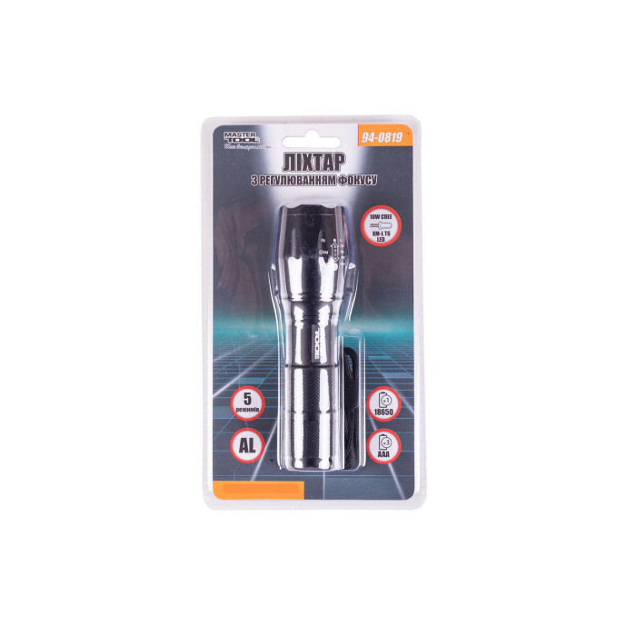 Яскравий світлодіод потужністю 10W, технологія CREE XM-L T6 LED світловий потік 600 lumen 5 режимів роботи яскравості світла: - 100% - 50% - 30% - "стробоскоп" - "SOS" має регулювання фокуса корпус виготовлений з анодованого алюмінію тип харчування: 3 батарейки AAA, або 1 акумулятор 18650. 1LED