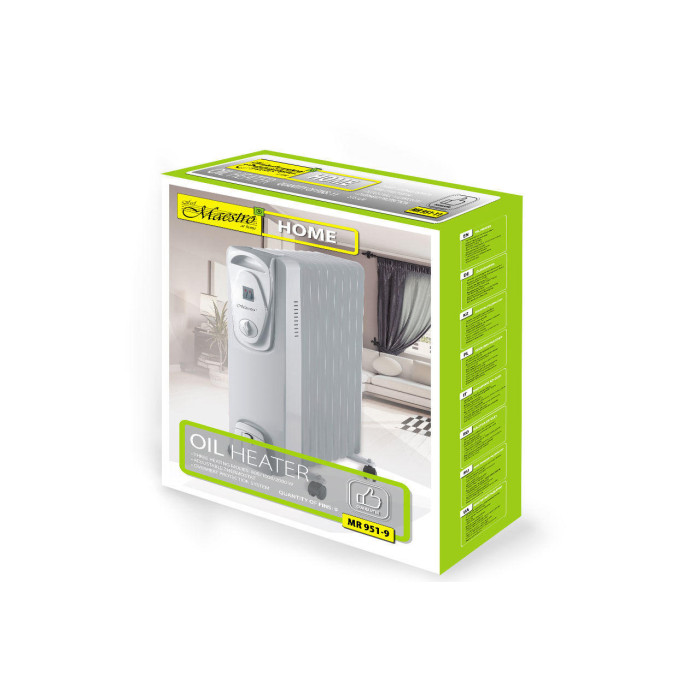 Масляний радіатор Maestro MR-951-9 має 9 секцій і потужність до 2000 Вт. Спеціальні термічні щілини забезпечують рівномірну циркуляцію теплого повітря, так що його температура буде однаковою і у статі, і під стелею. Користуватися радіатором просто і зручно - досить вибрати потрібну потужність і плавно відрегулювати температуру за допомогою тумблера термостата. Обігрівач оснащений коліщатками і ручкою для переміщення, що укупі з невеликою вагою і компактними розмірами робить його дуже маневреним і легким в русі. Контролювати стан радіатора вам допоможе спеціальний індикатор, а функція відключення при перегріванні попередить можливі неприємності, якщо ви раптом забудете вчасно відключити прилад.
