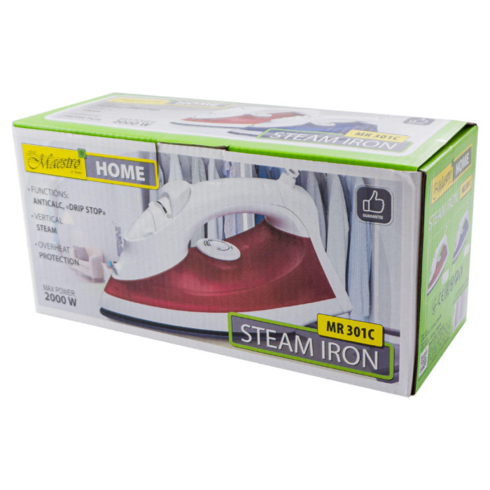 Праска Maestro MR-301C має потужність 1600 Вт. Режим постійної подачі пари дозволить швидко розгладити пом'яті тканини. Інтенсивність парового удару забезпечує легке рятування від глибоких складок на пересушеному одязі. Покриття підошви праски керамічне, забезпечує гарне ковзання по поверхні тканини. На корпусі пристрою вбудований перемикач температури, кнопка подачі пари і регулятор подачі пари.