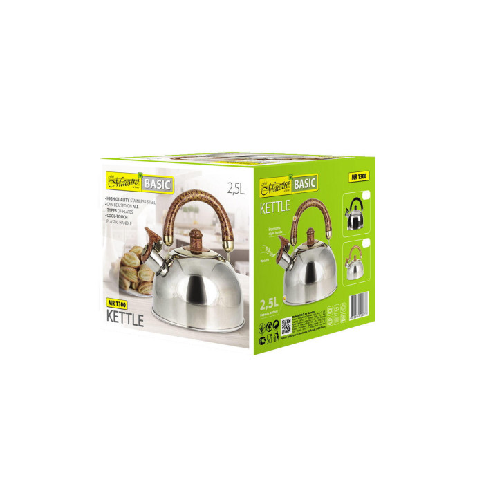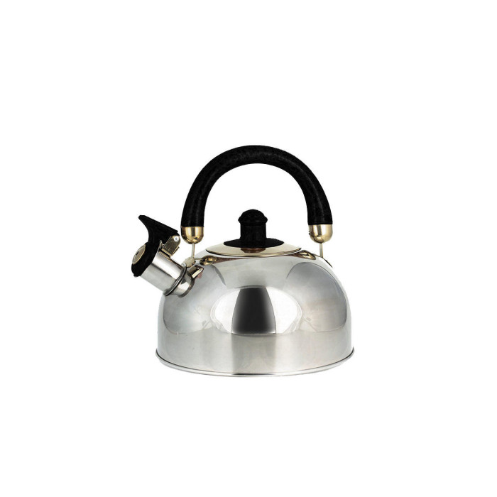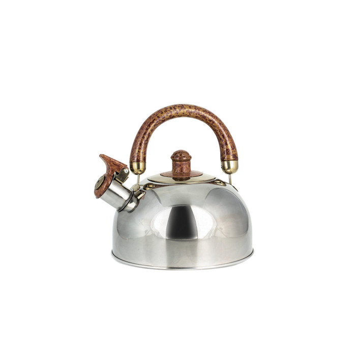 Чайник об'ємом в 2,5 л виготовлений з високоякісної нержавіючої сталі з глянсовою поліруванням. Оснащений клапаном-свистком і важелем для безпечного відкривання / закривання. Одношарове індукційне дно.Кришка чайника сталева з бакелітовій ручкою. Підходить для всіх типів плит, включаючи індукційні.
