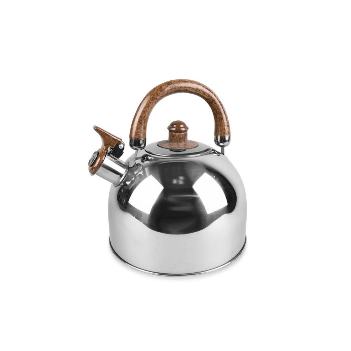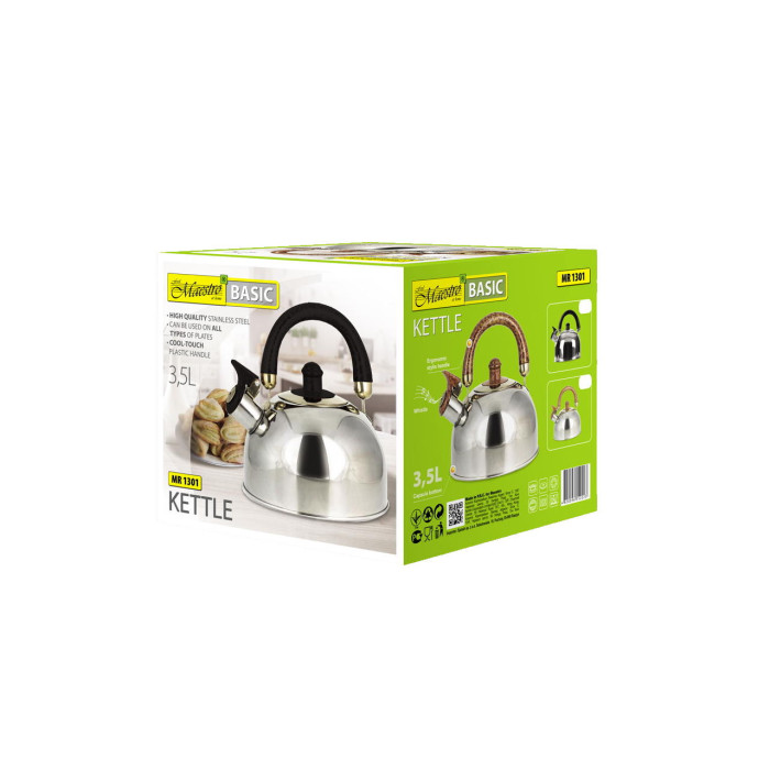 Чайник об'ємом в 3,5 л виготовлений з високоякісної нержавіючої сталі з глянсовою поліруванням. Оснащений клапаном-свистком і важелем для безпечного відкривання / закривання. Одношарове індукційне дно.Кришка чайника сталева з бакелітовій ручкою. Підходить для всіх типів плит, включаючи індукційні.