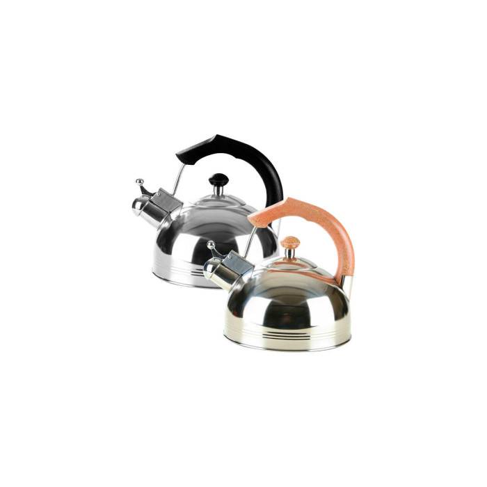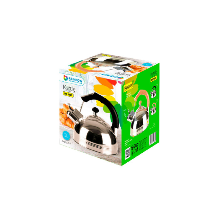Чайник об'ємом в 3 л виготовлений з високоякісної нержавіючої сталі з глянсовою поліруванням. Оснащений клапаном-свистком і важелем для безпечного відкривання / закривання. Одношарове індукційне дно.Кришка чайника сталева з бакелітовій ручкою. Підходить для всіх типів плит, включаючи індукційні.