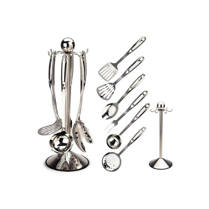 Набір складається з: лопатка, Картофелемялка, вилка, ополоник, шумовка, ложка, підставка. Нержавіюча сталь.