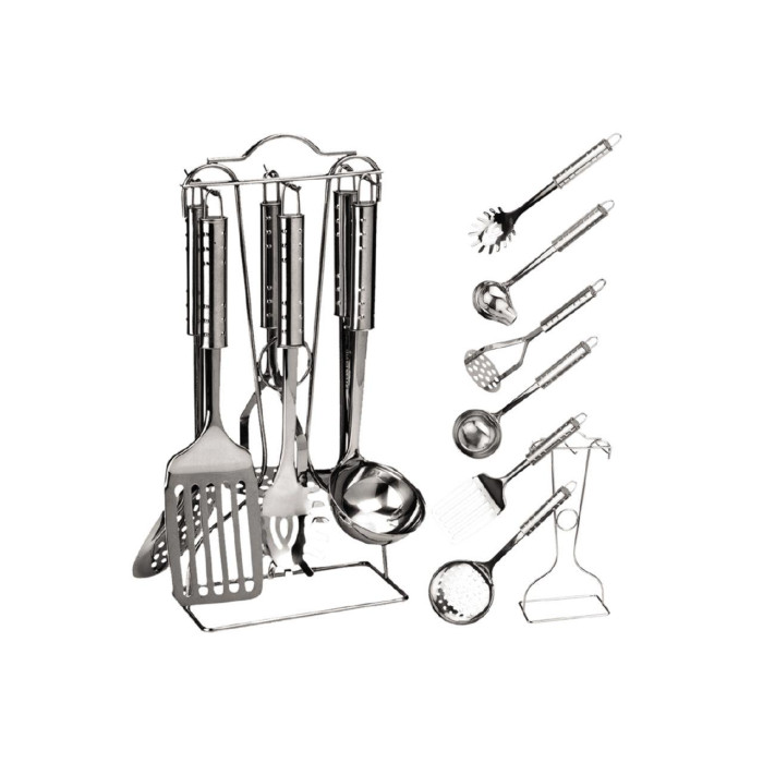 Набір складається з: лопатка, Картофелемялка, ополоник, шумовка, підставка, ложка для спагетті, соусник. Всі предмети виготовлені з нержавіючої сталі.