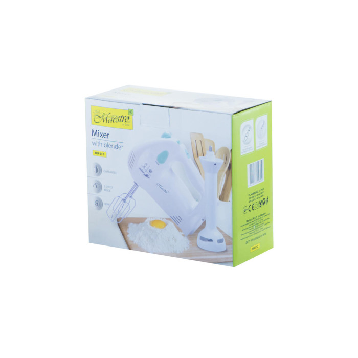 5 швидкісних режимів. Два віночка для збивання крему і яєць. Дві насадки для замісу густого тесту. Насадка блендер. Режим «Turbo». Кнопка звільнення насадок.