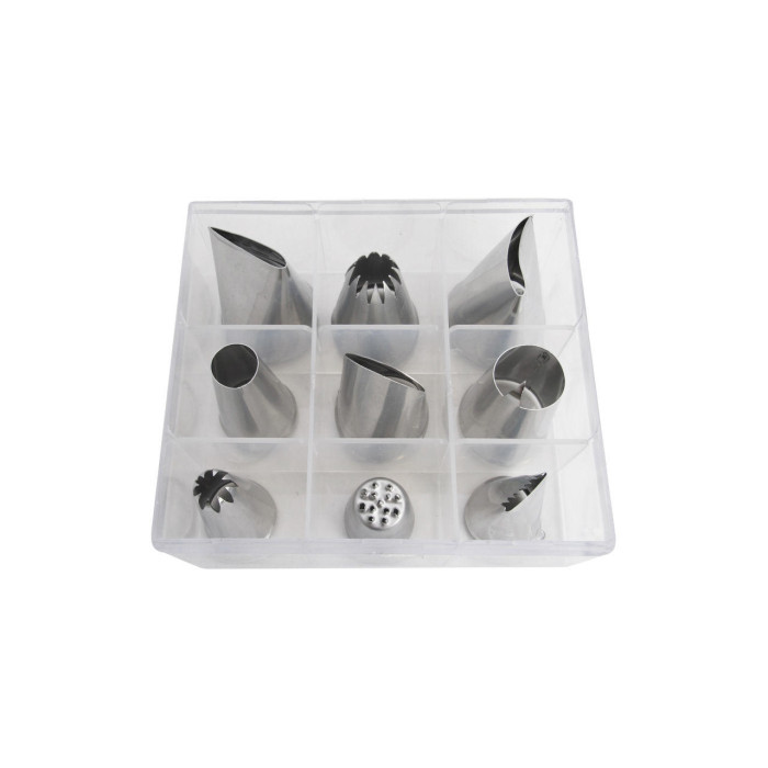 Набір насадок кондитерських Empire в допомогу початківцям кулінарам і професіоналам зі стажем. З їх допомогою майстра створюють кремові прикраси для мафінів, тістечок і тортів. Всі 9 елементів виготовлені з високоміцної нержавіючої сталі. Матюкав не схильний до корозії, а виразний рельєф вихідного отвору дає зелене світло найбільш незвичайним композиціям. Не менш важливою перевагою металевих насадок Empire над пластиковими аналогами вважається краща стійкість до ударів і подряпин.