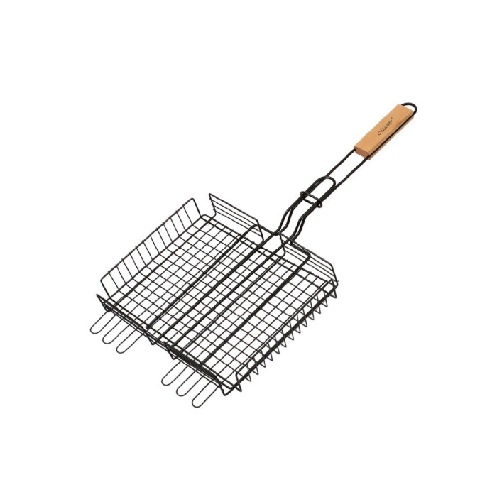 Конструкція решітки забезпечує стійке положення на мангалі. Антипригарне покриття, не дає можливості прилипати до прутів. Зручна ручка допомагає легко перевертати ґрати, не обпалюючи рук. Регульована висота решітки, зручна для використання різних продуктів
