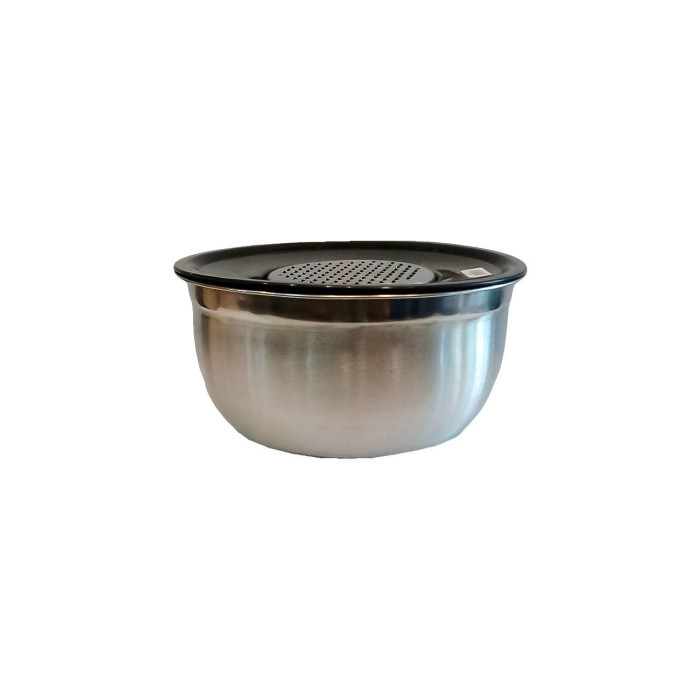 Миска з нержавіючої сталі для приготування та подачі їжі. Функціональна кришка зі змінними тертками дозволяє натерти продукти безпосередньо в миску. Три терки: для дрібного або більш товстого натирання, для нарізки скибочками. Отвір в кришці дозволяє використовувати блендер або міксер без розплескування вмісту. Антиковзаюче покриття підстави миски.