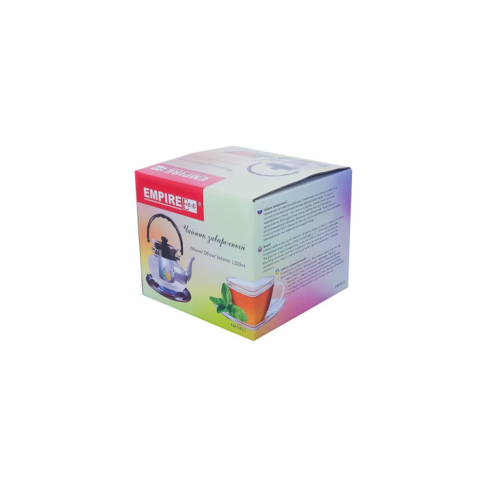 Чайник заварювальний Empire об'ємом 1100 мл, діаметром дна 90 мм. Виконаний з термостійкого скла, він проявляє підвищену стійкість до різких температурних перепадів. У стандартному вигляді матеріал витримує до 80 градусів морозу і майже 526 градусів спеки. Завдяки таким властивостям сировини чайник можна зберігати в холодильнику, а при необхідності, годинами тримати на печі. Загальна висота ємності - 190 мм. Висота без ручки - 130 мм. Діаметр кришки - 75 мм, а висота - 45 мм. Модель не впливає на смак інгредієнтів. До іншим її переваг слід зарахувати оптимальну вагу, ергономічний дизайн і простий догляд в посудомийній машині.