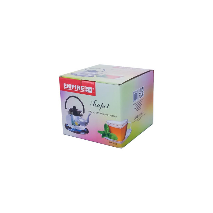 Чайник заварювальний Empire об'ємом 1300 мл, діаметром дна 90 мм. Виконаний з термостійкого скла, він проявляє підвищену стійкість до різких температурних перепадів. У стандартному вигляді матеріал витримує до 80 градусів морозу і майже 526 градусів спеки. Завдяки таким властивостям сировини чайник можна зберігати в холодильнику, а при необхідності, годинами тримати на печі. Загальна висота ємності - 200 мм. Висота без ручки - 145 мм. Діаметр кришки - 75 мм, а висота - 40 мм. Модель не впливає на смак інгредієнтів. До іншим її переваг слід зарахувати оптимальну вагу, ергономічний дизайн і простий догляд в посудомийній машині.