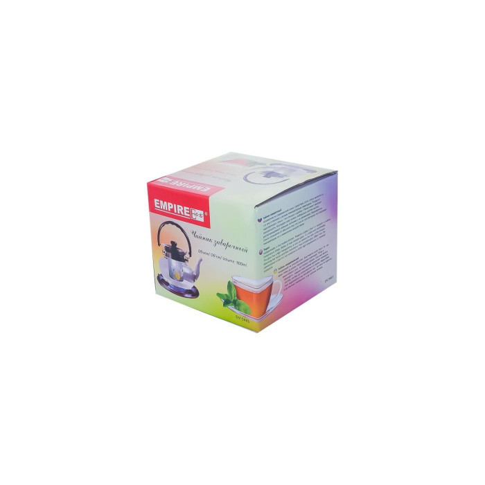Чайник заварювальний Empire об'ємом 900 мл, діаметром дна 80 мм - в топі подарунків для домашньої кухні. Виконаний з термостійкого скла, він проявляє підвищену стійкість до різких температурних перепадів. У стандартному вигляді матеріал витримує до 80 градусів морозу і майже 526 градусів спеки. Завдяки таким властивостям сировини чайник можна зберігати в холодильнику, а при необхідності, годинами тримати на печі. Загальна висота ємності - 180 мм. Висота без ручки - 130 мм. Діаметр кришки - 75 мм, а висота - 40 мм. Модель не впливає на смак інгредієнтів. До іншим її переваг слід зарахувати оптимальну вагу, ергономічний дизайн і простий догляд в посудомийній машині.
